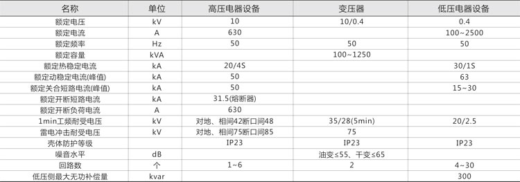 1. 本產(chǎn)品由高壓配電裝置、變壓器及低壓配電裝置聯(lián)接而成,分成三個(gè)功能隔室,即高壓室、變壓器室和低壓室,高、低壓室功能齊全,高壓側(cè)一次供電系統(tǒng),可布置成環(huán)網(wǎng)供電、終端供電、雙電源供電等多種供電方式,還可裝設(shè)高壓計(jì)量元件,滿足高壓計(jì)量的需求。變壓器室可選擇S9、SC以及其他系列低損耗油浸式變壓器或干式變壓器;低壓室根據(jù)用戶要求可采用面板或柜裝式結(jié)構(gòu)組成用戶所需供電方案,有動(dòng)力配電、照明配電、無功功率補(bǔ)償、電能計(jì)量和電量測量等多種功能,滿足用戶的不同要求。并方便用戶的供電管理和提高供電質(zhì)量。